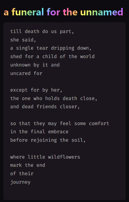I haven't figured out how I want to showcase my poetry on this page yet, so I've included five here as images to satiate your curiosity while I figure it out.