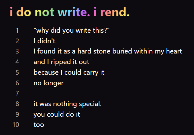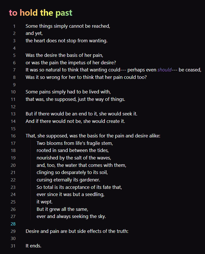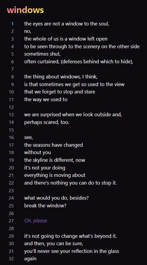Anyway, I got over myself and started writing poetry in early 2025. Since then, I kinda fell in love with poems, and now I'm studying the medium, submitting to contests, and otherwise having a so-called 'grand old time'.